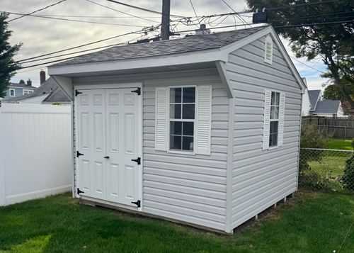 Turn your storage dream into reality with one of our custom sheds. Our Sheds are available in several different styles with either vinyl or wood construction. All Sheds are built on 4x4 pressure-treated skids, 16" on center studs, Aluminum Diamond doorplate, Aluminum drip edge, Architectural shingles & a locking door.
